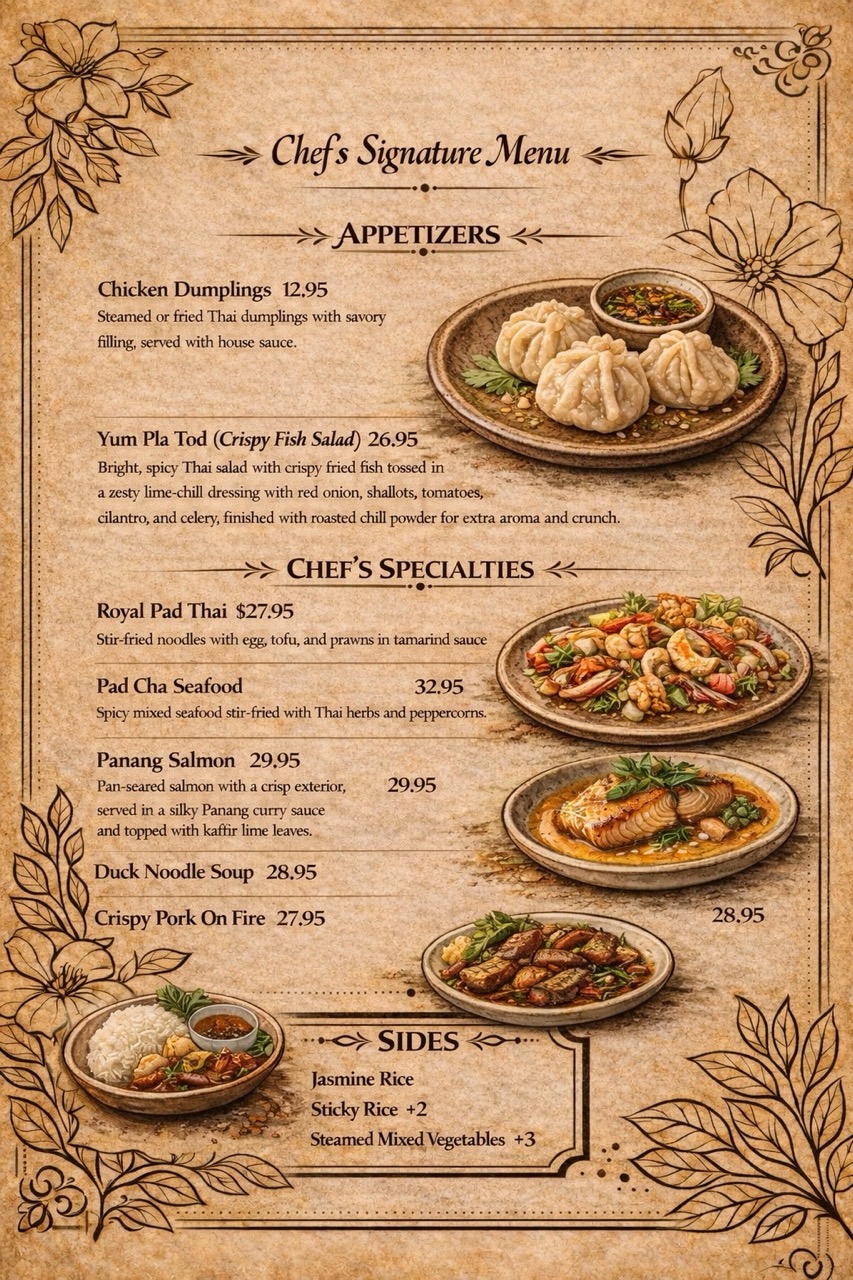 We believe in preserving the authentic flavors and techniques of Thai cooking while providing a modern dining experience that fits perfectly in New York City.